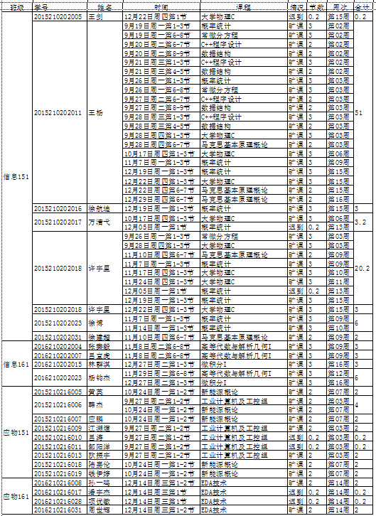 2016-2017学年第1学期理学院第1-16周学生旷课情况
